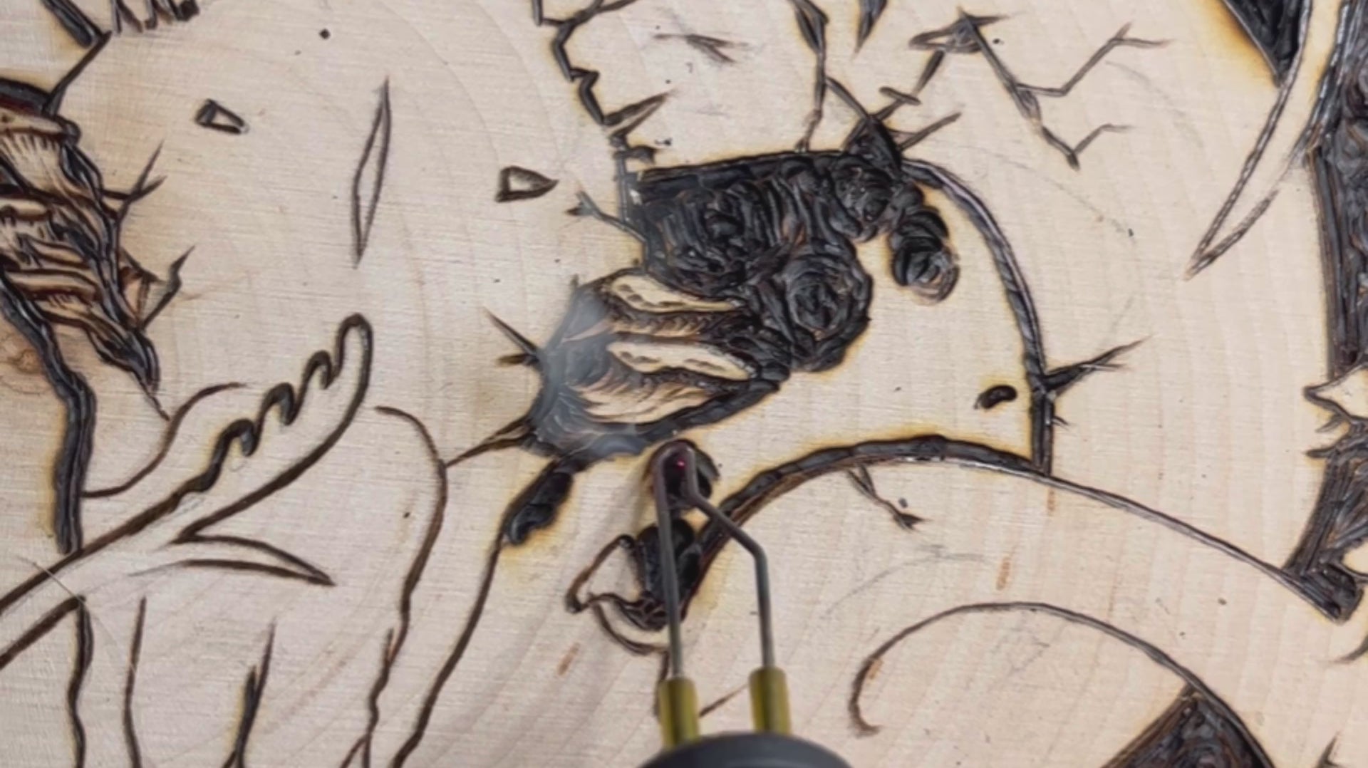 This pyrography artwork is an original design sketched digitally by the shop owner and transferred onto the basswood block which was then carefully burned by hand for over 10 hours using the tool pictured.